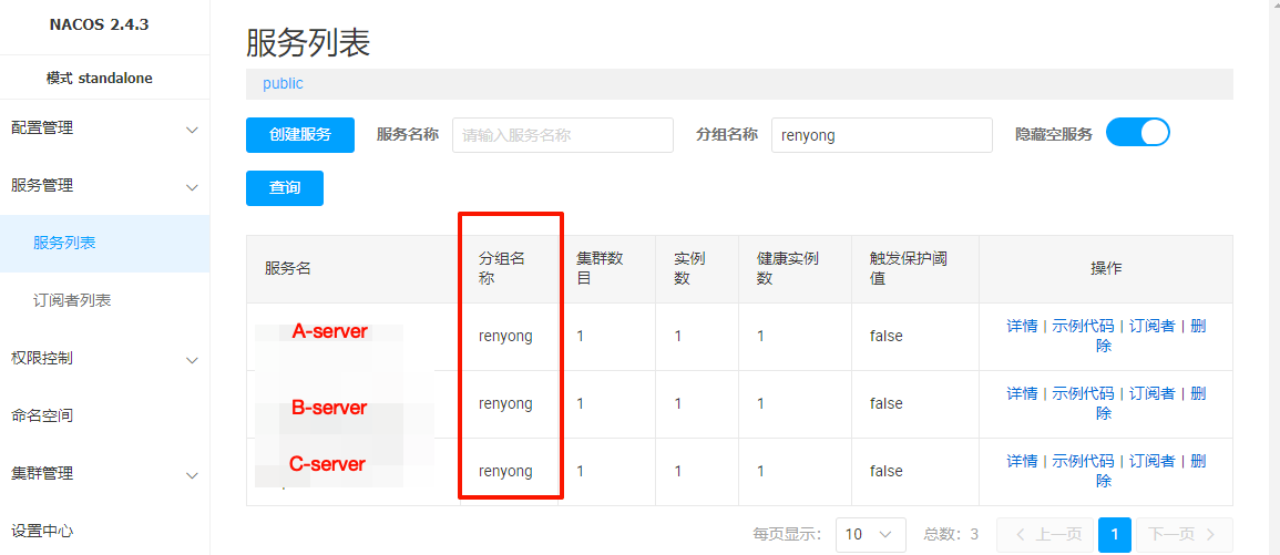 - A,B,C 是我们的服务注册到nacos默认的
