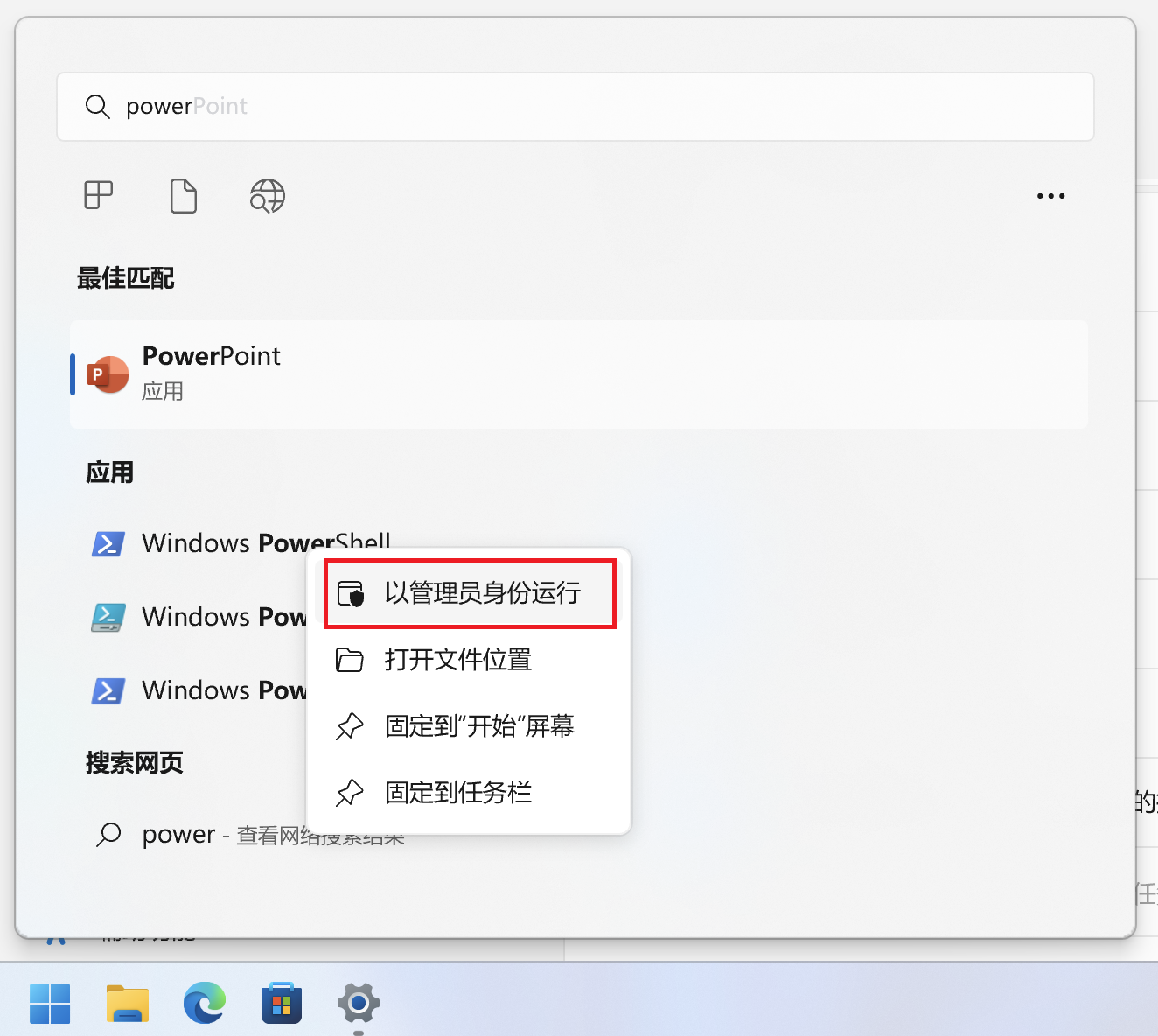 点击开始开始,键入powershell,找到windows powershell,右击以管理员运行