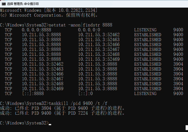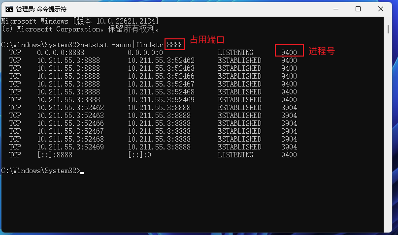 netstat -anon|findstr 8888